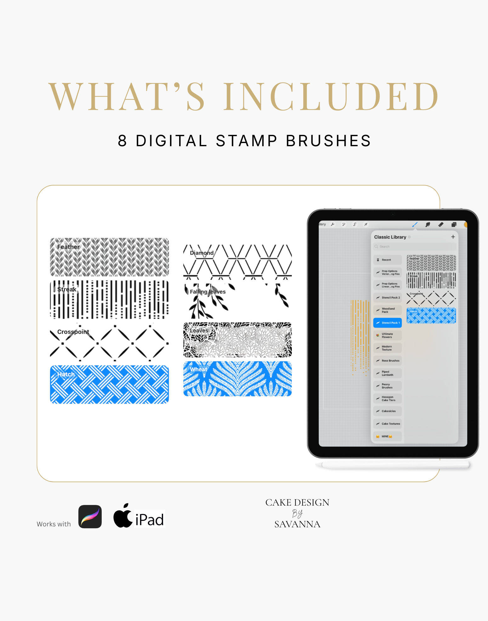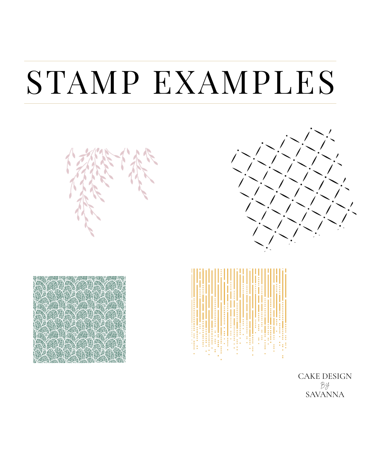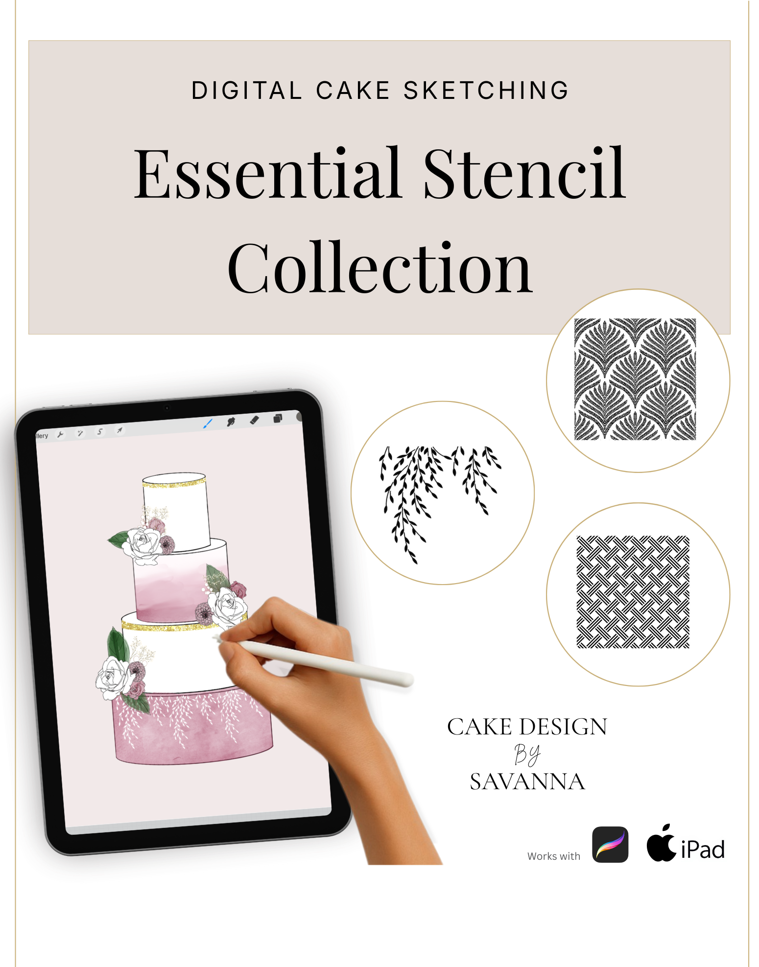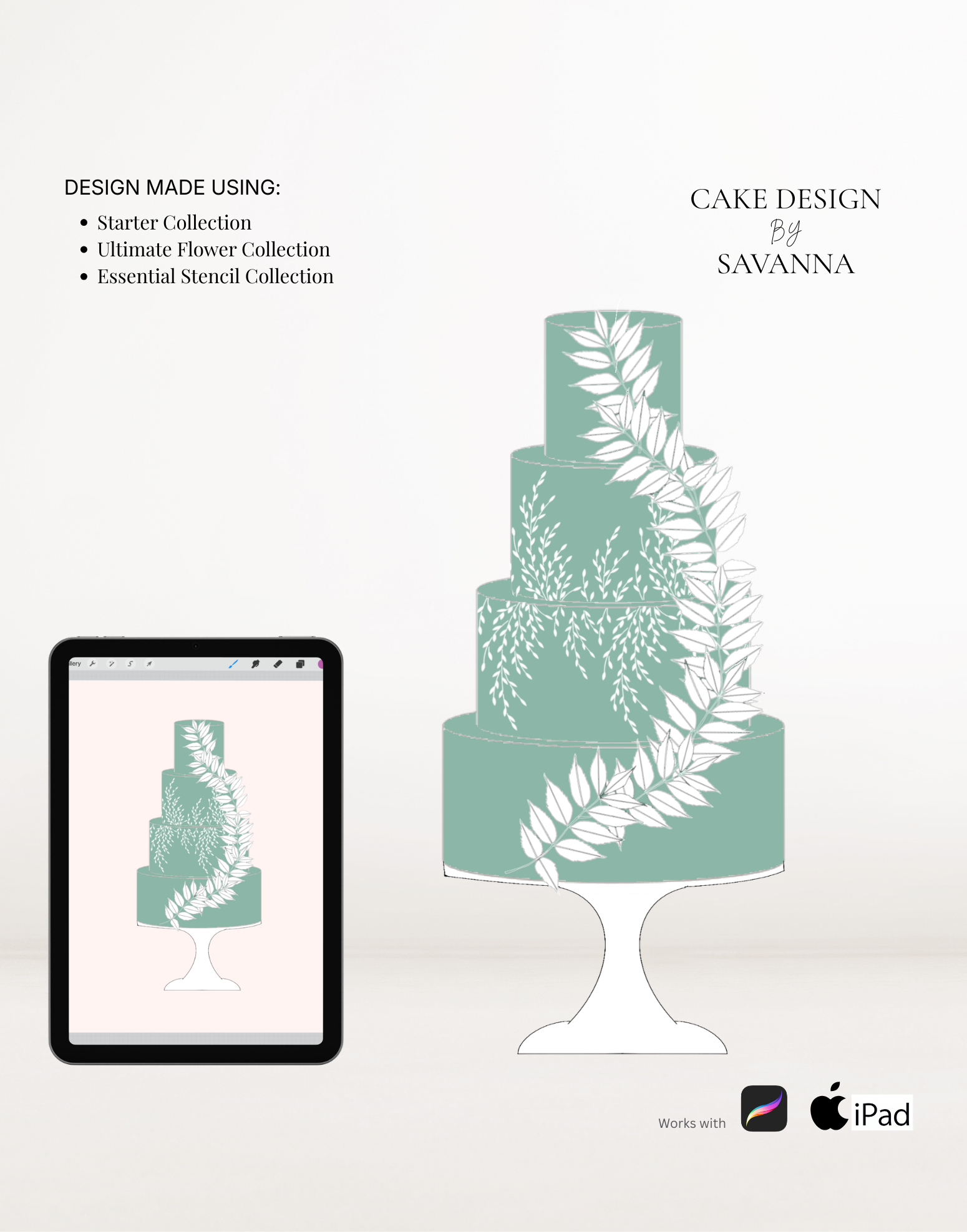In this Procreate stamp pack you will receive 2 files. Each with 4 stencils. so 8 Stencil brushes/stamps in total. Simple to use, just stamp onto the cake design and resize and duplicate as needed.