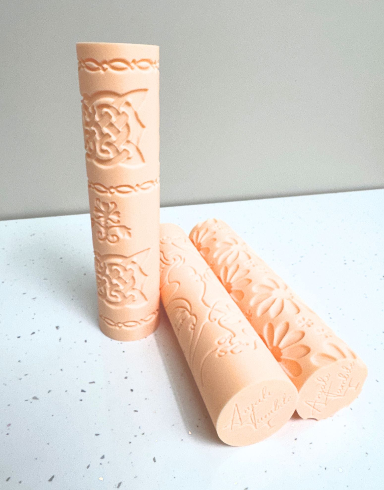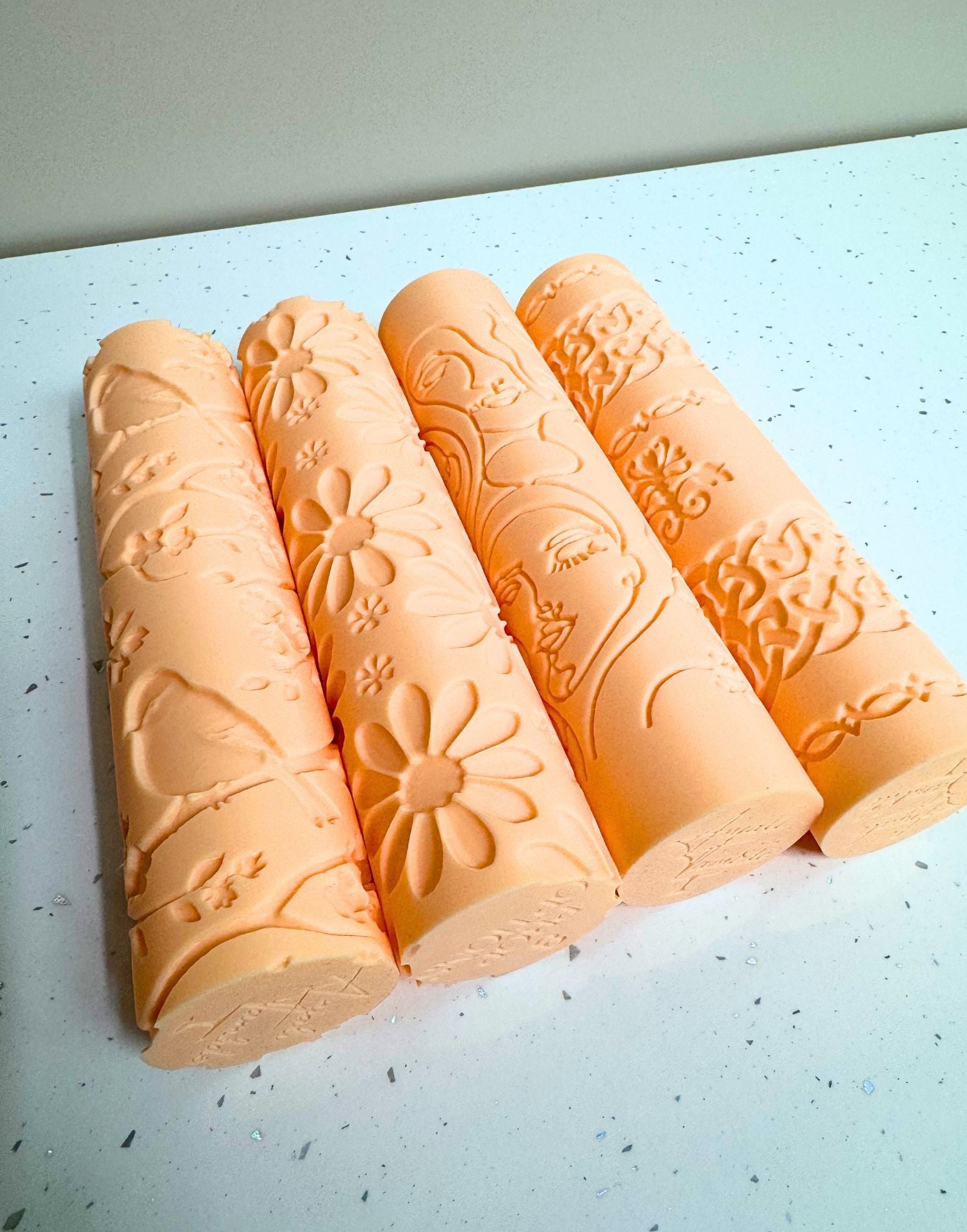 For an even texture across the whole surface, roll slowly and smoothly with steady hands. Apply consistent pressure through the centre and both ends of the rolling pin as you roll, so the imprint stays uniform from edge to edge.