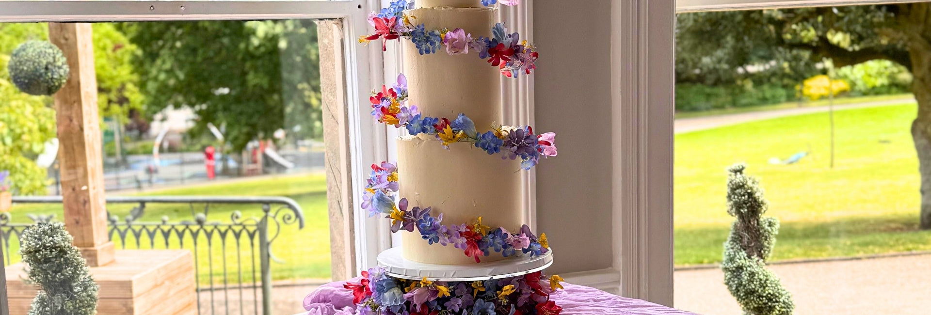 For a truly breathtaking display, consider adorning your cake spiral with a cascade of gorgeous faux flowers. Practical and everlasting, this stunning creation by The Flowering Baker, in collaboration with Petal Wild, beautifully illustrates how vibrant blooms and lush foliage can seemingly grow around each tier, creating a natural and romantic feel.
