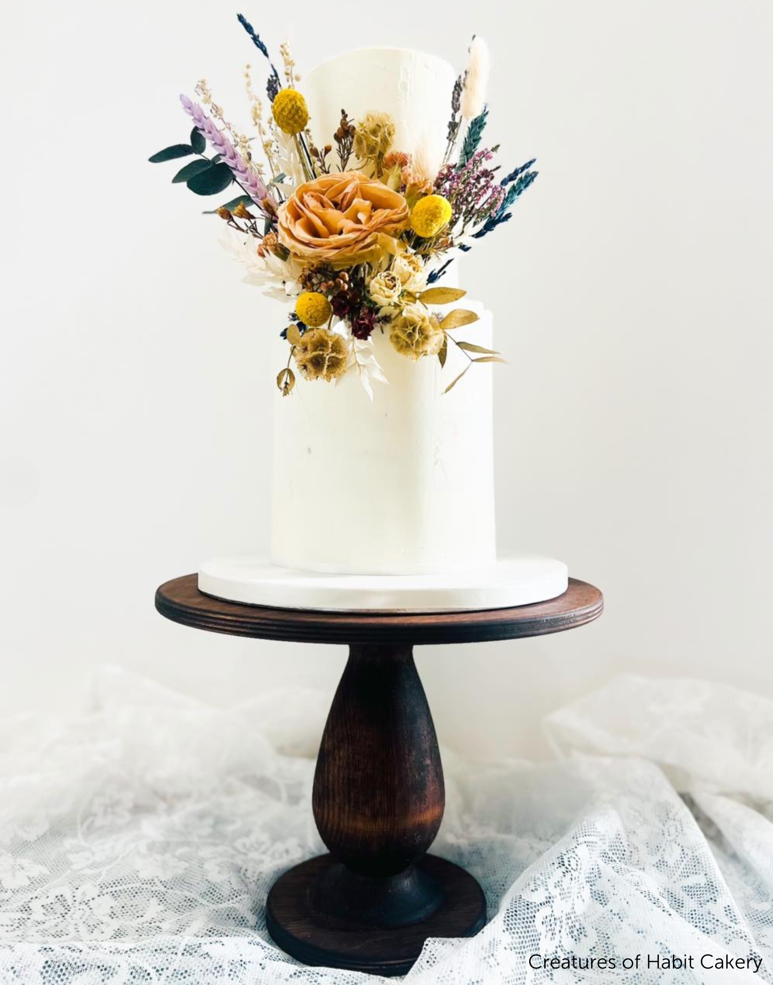 @creaturesofhabitcakery aporta un toque de romance otoñal sobre nuestro pedestal de madera hecho a mano, donde una ráfaga de colores agrega la calidez perfecta a este impresionante diseño.