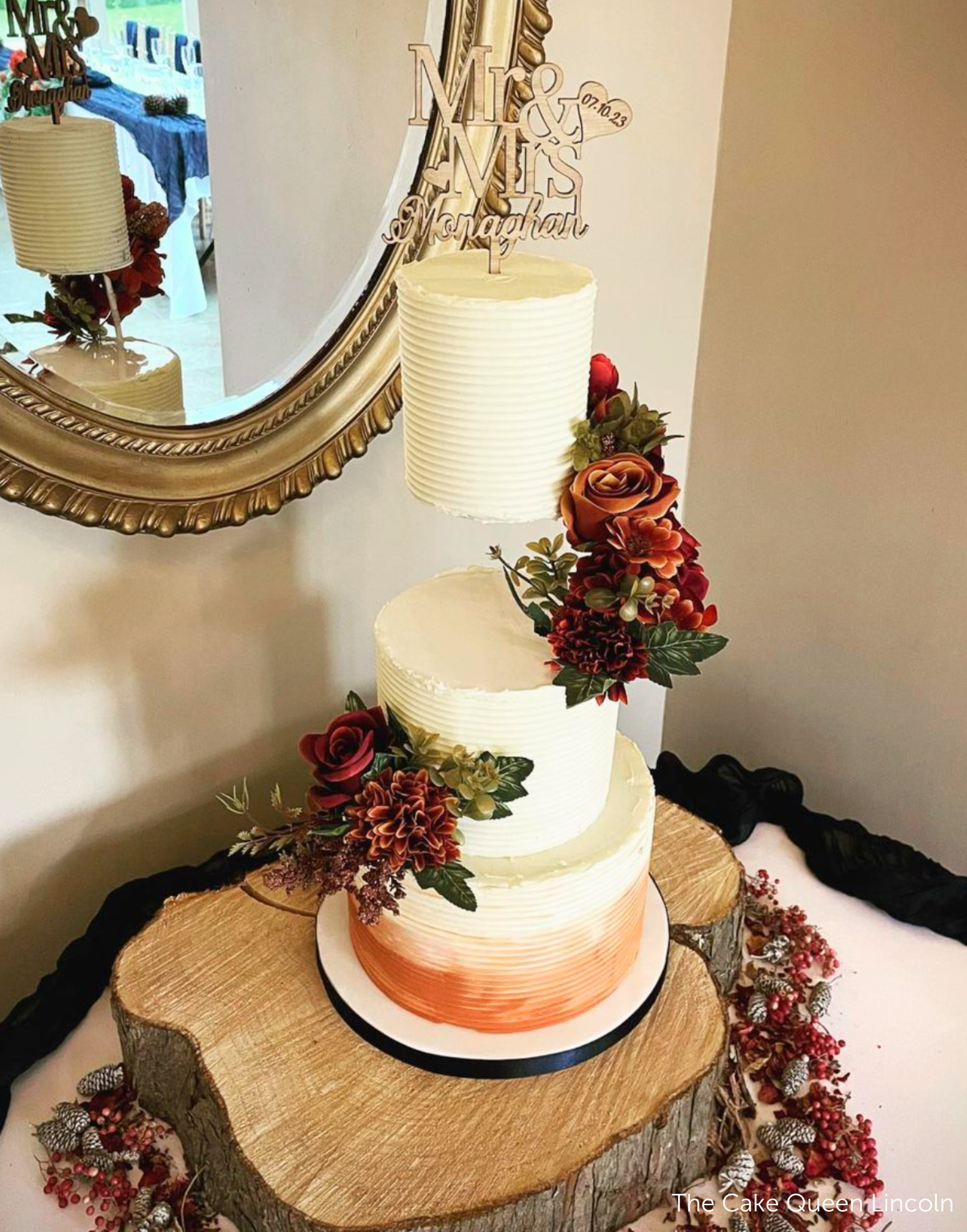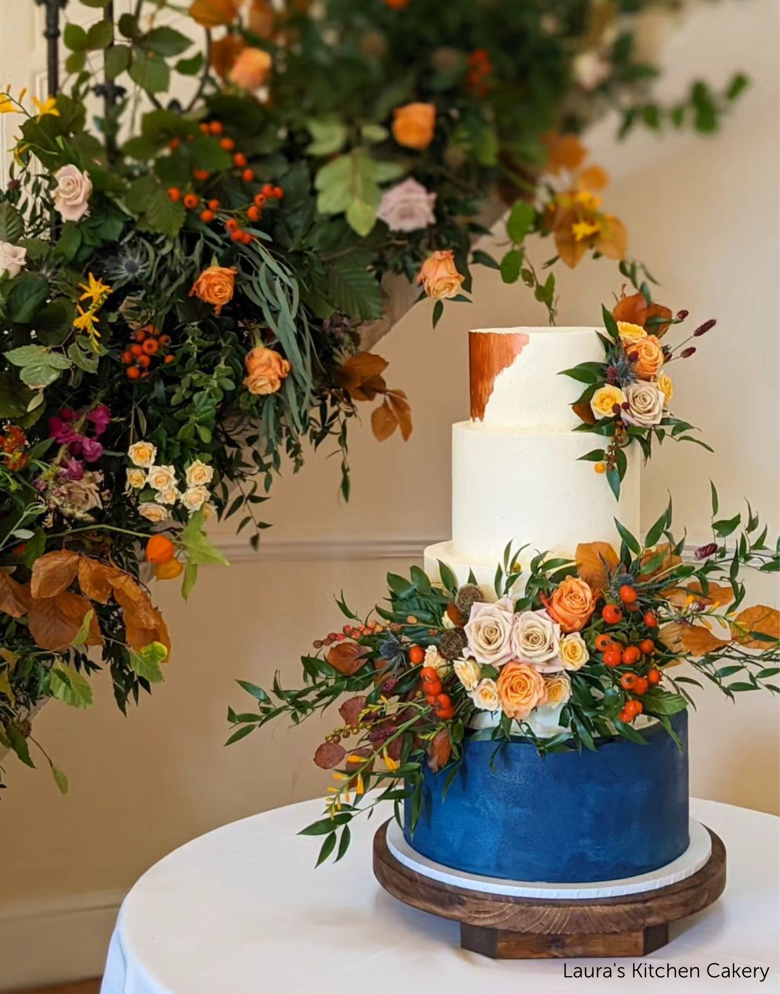 @lauraskitchencakery, que aporta vibraciones otoñales en abundancia, ha creado un magnífico diseño escalonado que combina maravillosamente con nuestro soporte para pasteles Rustic Olive Board.