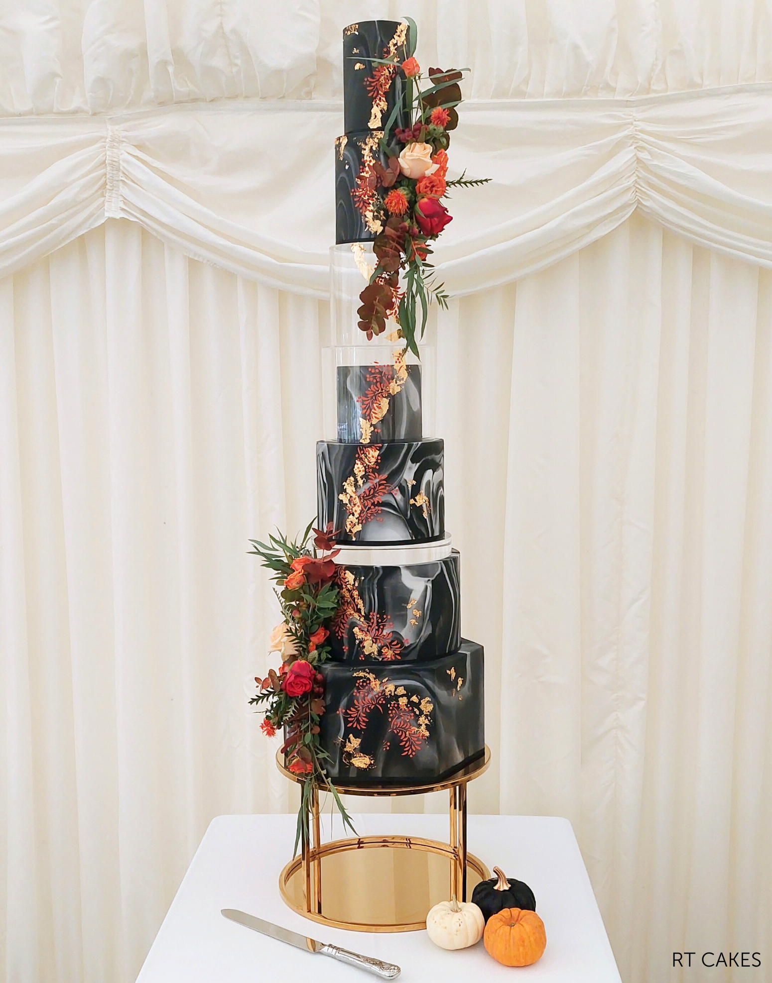 Una obra maestra imponente que irradia la sensación del otoño de @rtcakes . Tonos dramáticos, altura y flores se combinan a la perfección con esta combinación de acrílico y oro espejo.