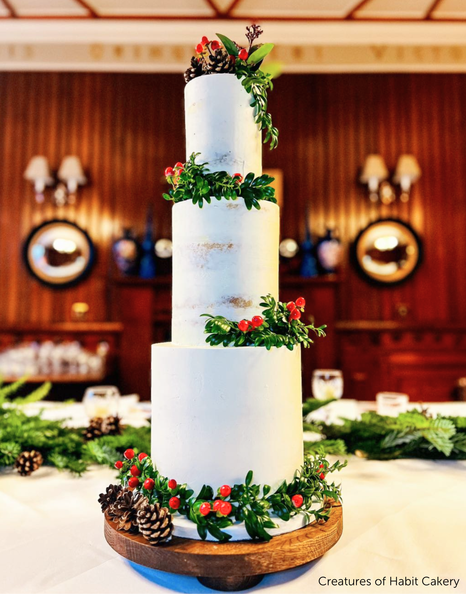 Las bayas festivas y el follaje verde de temporada añaden un encanto maravillosamente natural a este diseño de pastel navideño tradicional de @creaturesofhabitcakery .