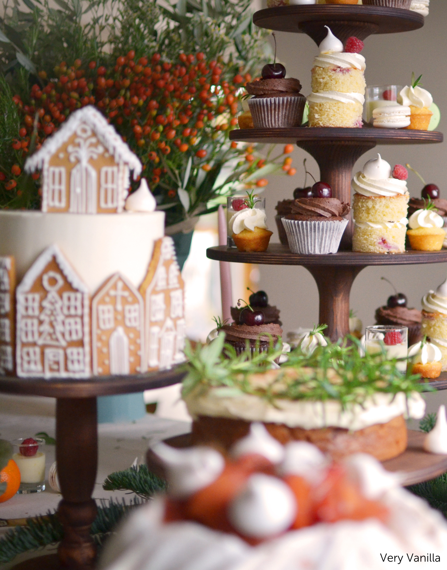 @very.vanilla crea una encantadora decoración festiva para la mesa del té de la tarde con casitas de jengibre y una variedad de tentadoras golosinas colocadas sobre nuestros expositores hechos a mano. ¡La Navidad nunca se vio tan bien!