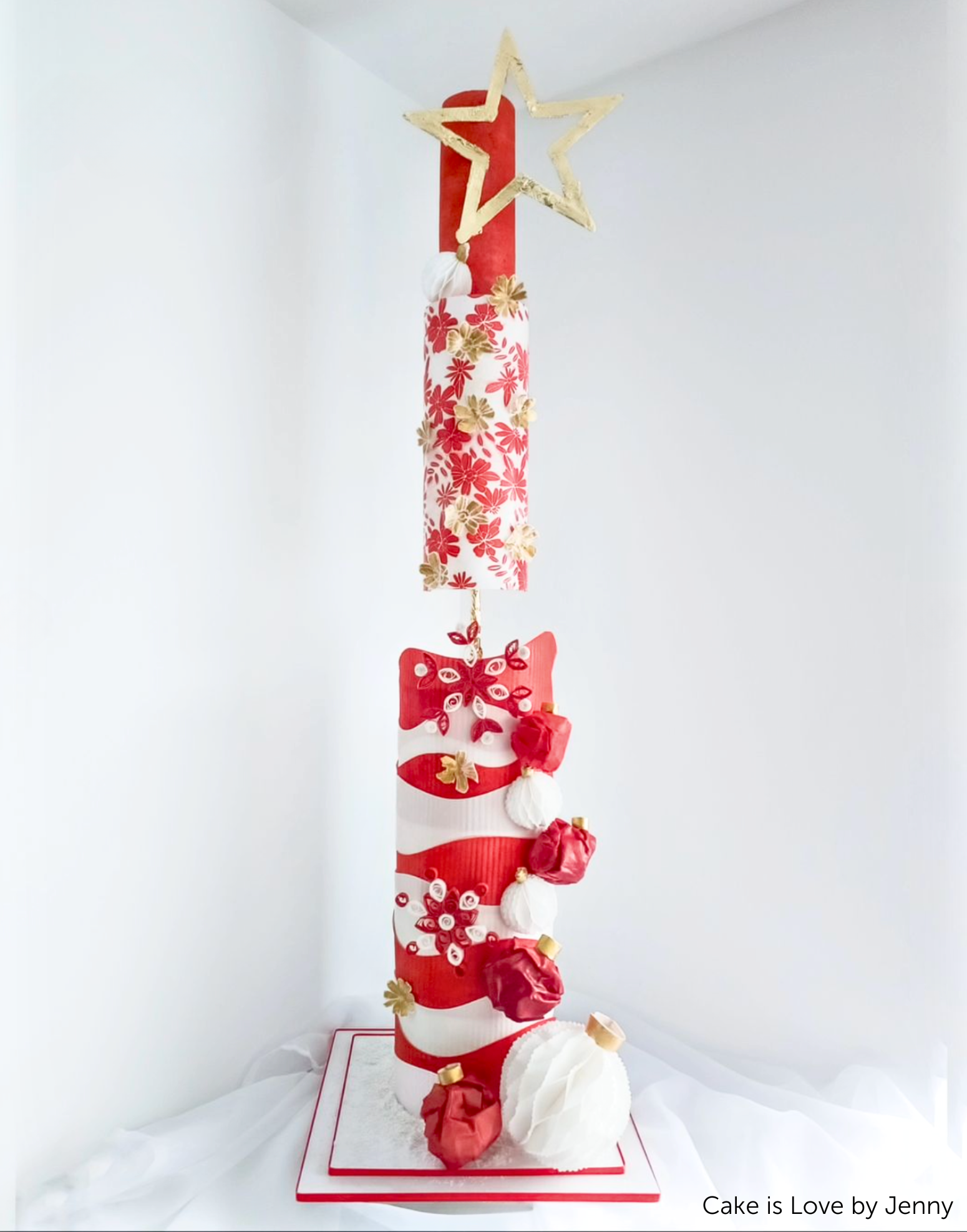 Con una enorme altura de 43 pulgadas y una temática perfecta con los colores tradicionales de los bastones de caramelo, @cakeislovebyjenny crea un verdadero espectáculo festivo con adornos arrugados, plantillas y un toque de brillo de oblea con hojas de oro.