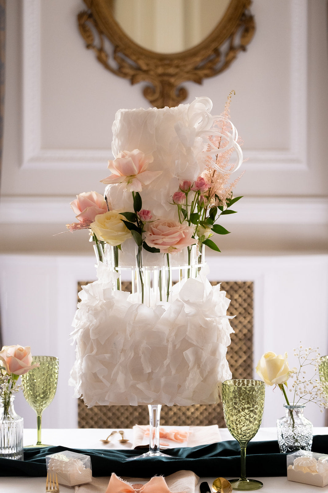 Bien sûr, en tant qu'artiste pâtissière, j'avais hâte de présenter ma pièce de résistance : un gâteau conçu avec le diadème floral de Prop Option. Fabriqué avec précision, le Cake Tiara offre différentes options de composition florale dans la conception de gâteaux. Que vous recherchiez un look classique et royal ou une ambiance fantaisiste et moderne, des motifs floraux complexes aux designs épurés et minimalistes, les options sont infinies. Mon style de gâteau est élégant, haut et présente des textures avec un amour pour l'art floral en utilisant principalement des fleurs fraîches et en soie ; le diadème floral se prête parfaitement à mon style. J'ai créé un gâteau à 3 étages fortement texturé avec du papier gaufré, en utilisant le diadème floral pour l'élever à 4 étages et en ajoutant des fleurs au design.