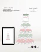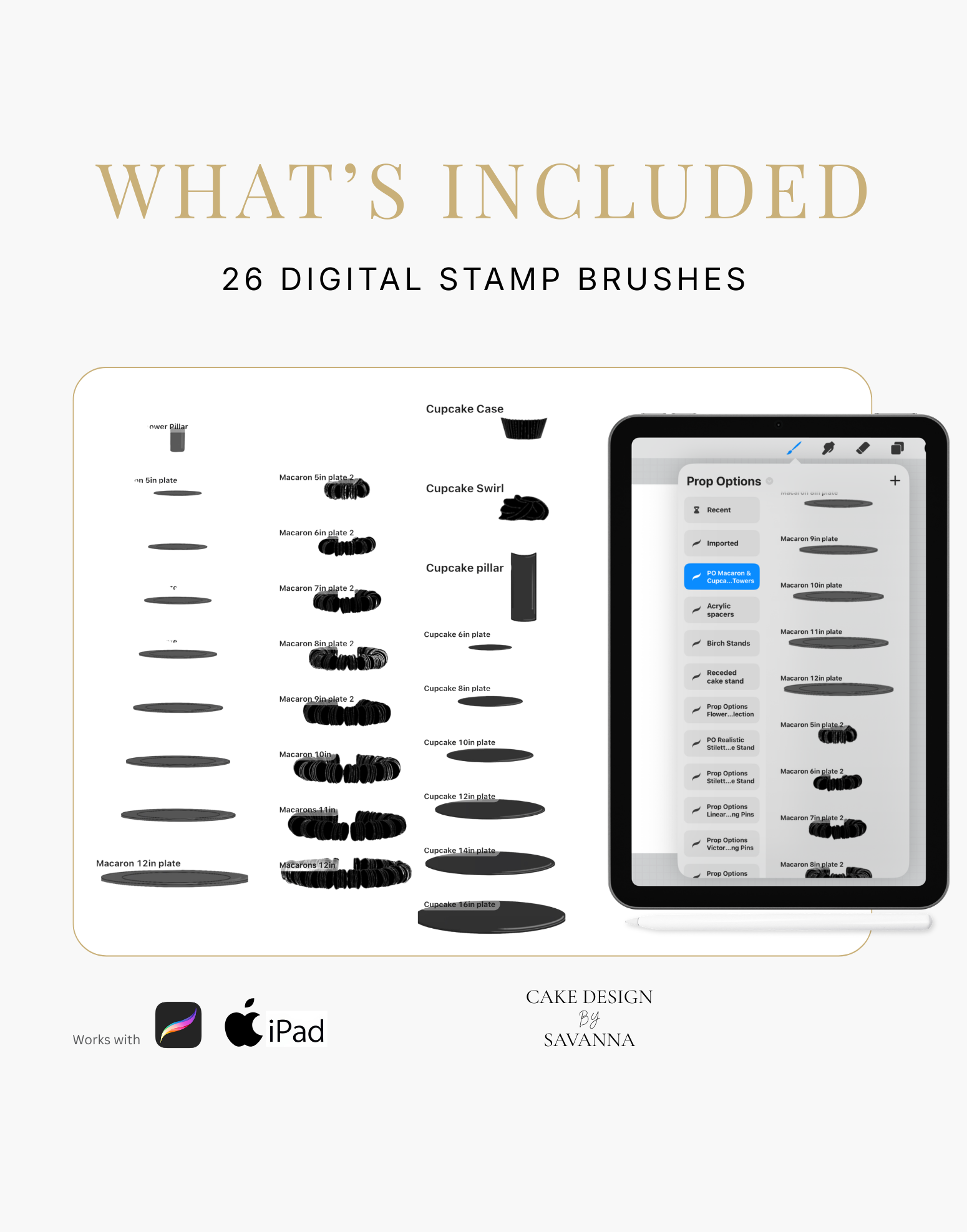 This Procreate stamp set includes 26 highly detailed, modular brushes featuring the Prop Options Macaron Stand and Cupcake Stand with a realistic acrylic finish.