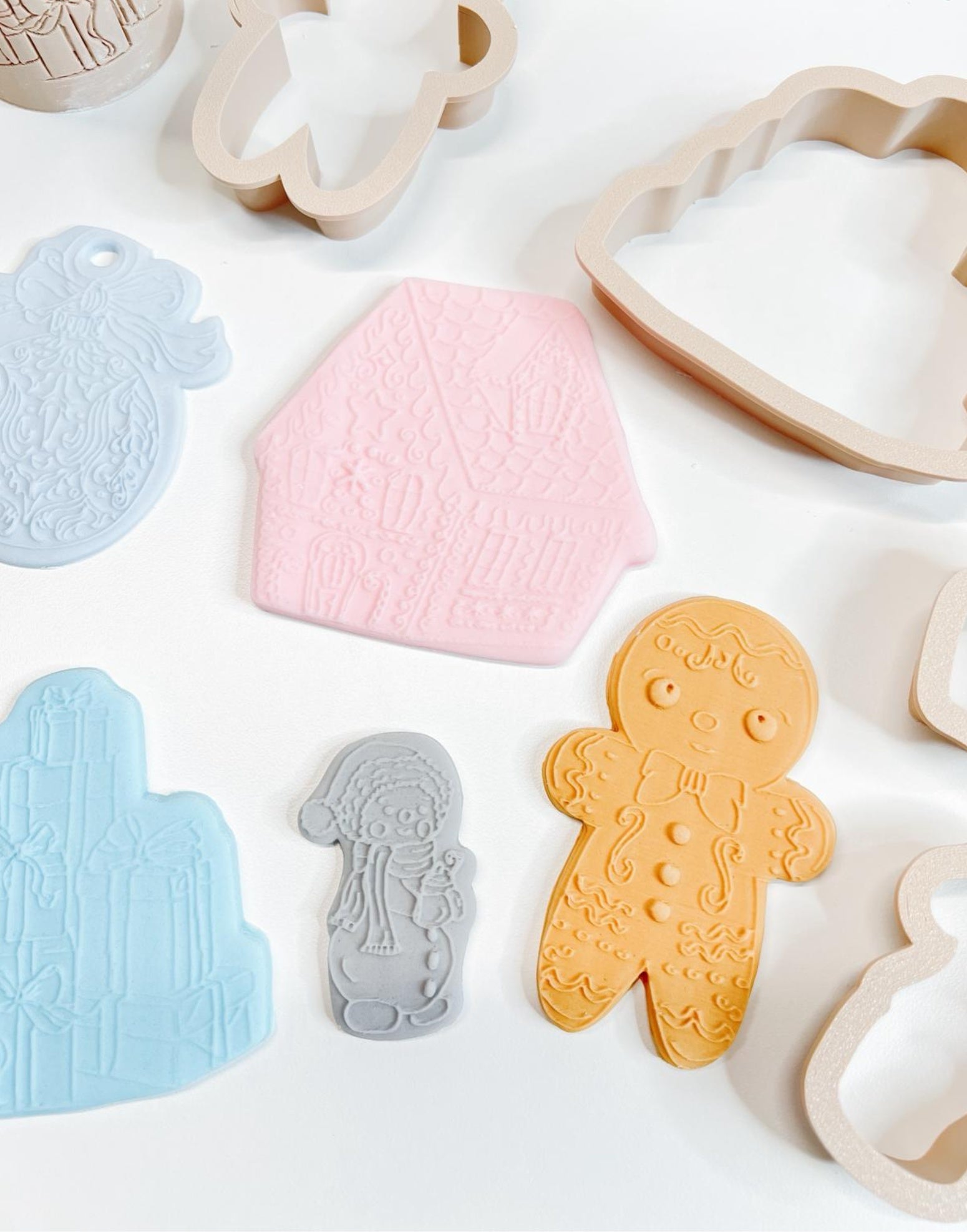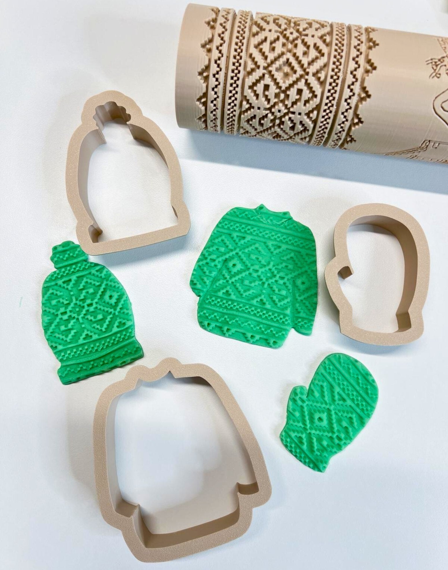 Matching cutters for the Winter Wonderland motifs, including hats, snowglobes and character shapes for consistent, repeatable designs.