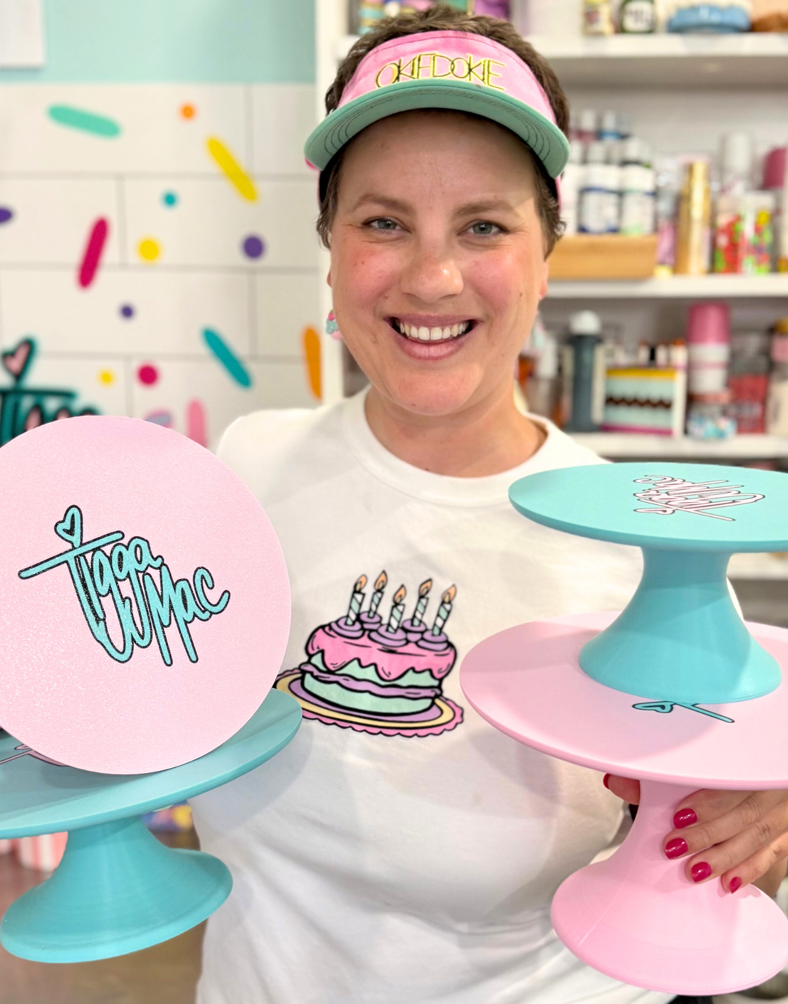 Each stand has its own proportions: the Tigga Pink stand is 6 inches tall, while the Tigga Aqua stand is 4 inches tall, regardless of the top plate size. Together, they create a beautifully balanced display that adds height variation and playful contrast to any setup.